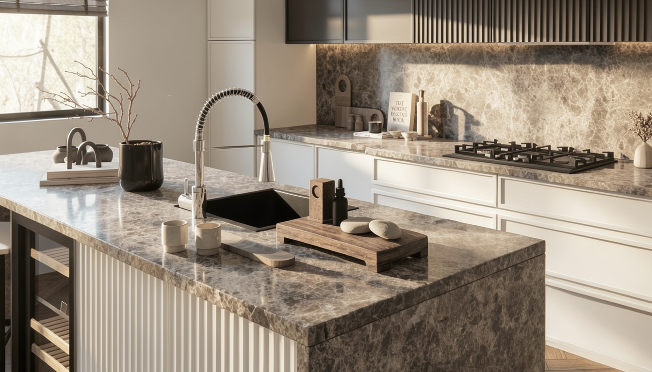 Централно място заема техническият камък с дълбока, многопластова текстура и деликатни кафяви нишки – материал, който придава тежест, характер и неподвластна на времето естетика. Използван както за плот, така и за гръб, той оформя цялостна и завършена композиция. Контрастът с тъмните горни шкафове внася драматичност и ясно дефинира обема, докато вертикалните дървесни елементи добавят мекота и архитектурен ритъм. Островът е решен като скулптурен акцент – едновременно функционален и визуално въздействащ, допълнен от елегантен бар стол с изчистен силует. Вградените уреди са дискретно вписани, запазвайки чистотата и цялостната естетика на интериора.