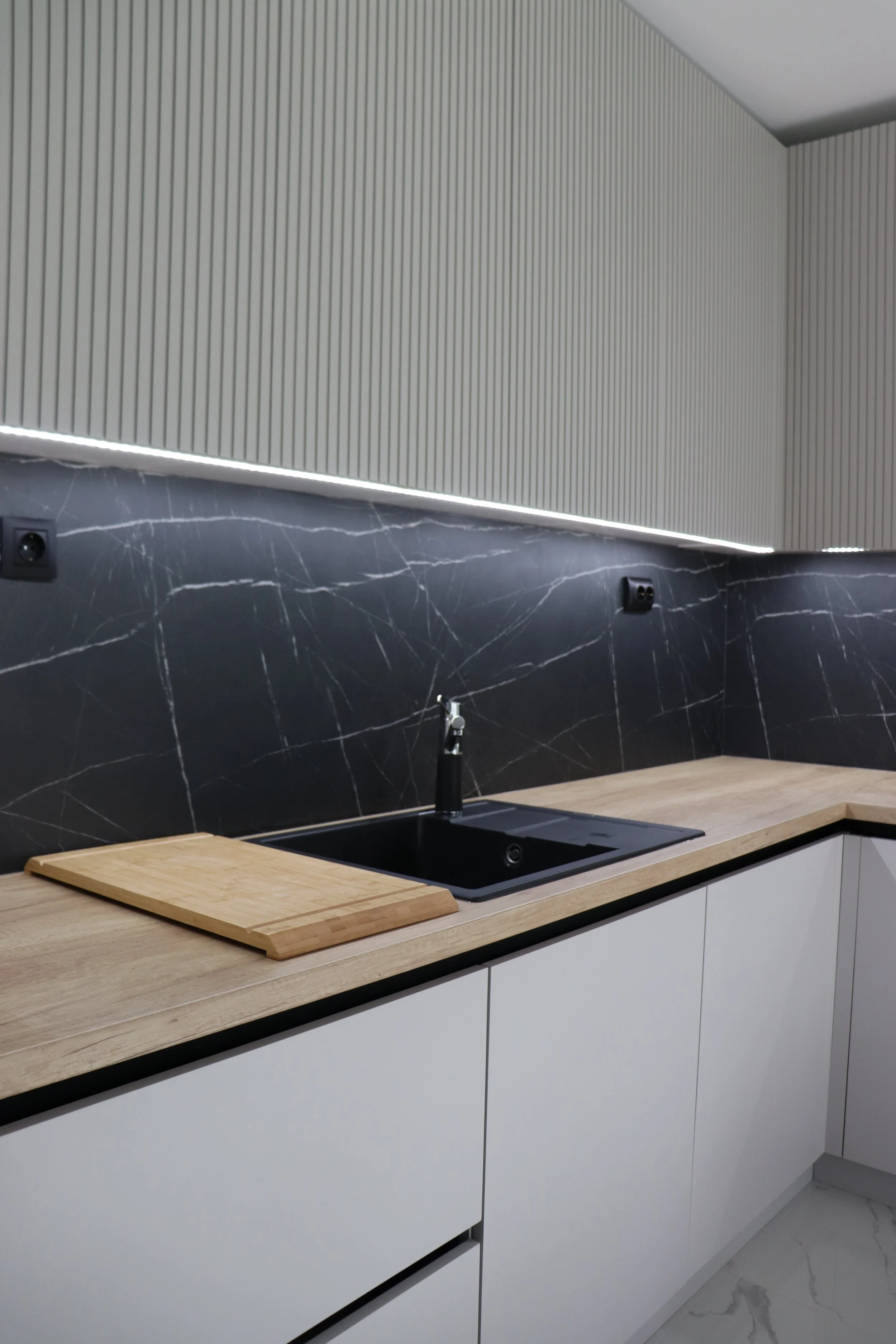 Г-образната кухня е изградена с внимание към детайла – горният ред с фрезовани врати придава характер и дълбочина, докато долният ред остава изчистен и модерен. Черните елементи в кант дръжките, мивката и смесителя създават фин контраст и завършеност на визията. Комбинацията от термоплот и термогръб в дървесен декор и черен мрамор добавя усещане за стил и устойчивост, като същевременно подчертава модерното звучене на пространството.