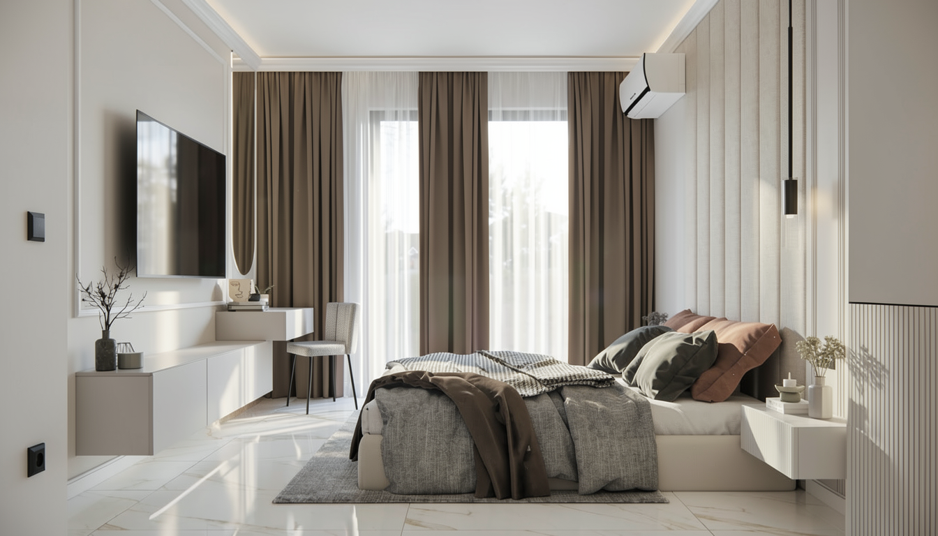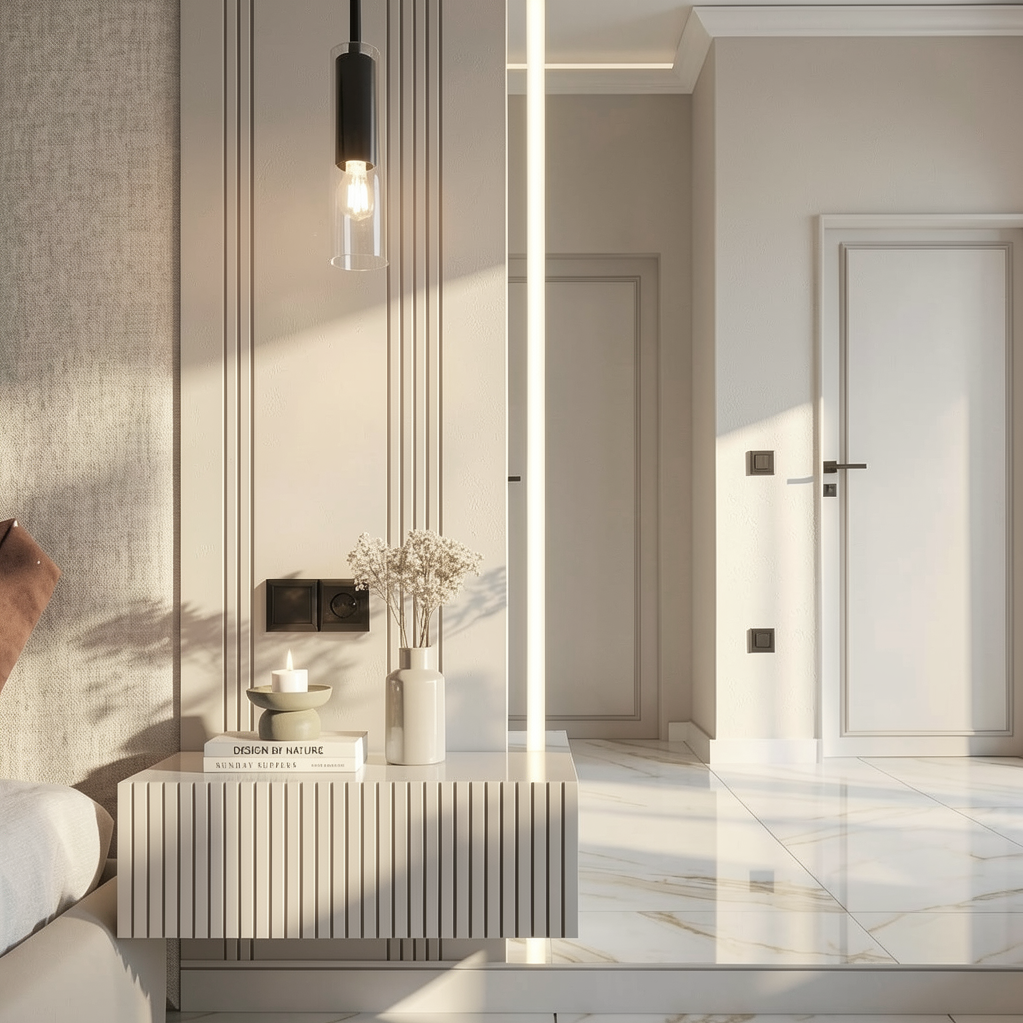 Подовите настилки в цялата къща са изпълнени от мраморен гранитогрес, който допринася за елегантния и изчистен облик на пространствата. Всички мебели са проектирани и изработени по поръчка в nude цвят с фини декоративни фрезовки, които добавят характер и стил, без да нарушават минималистичната визия.