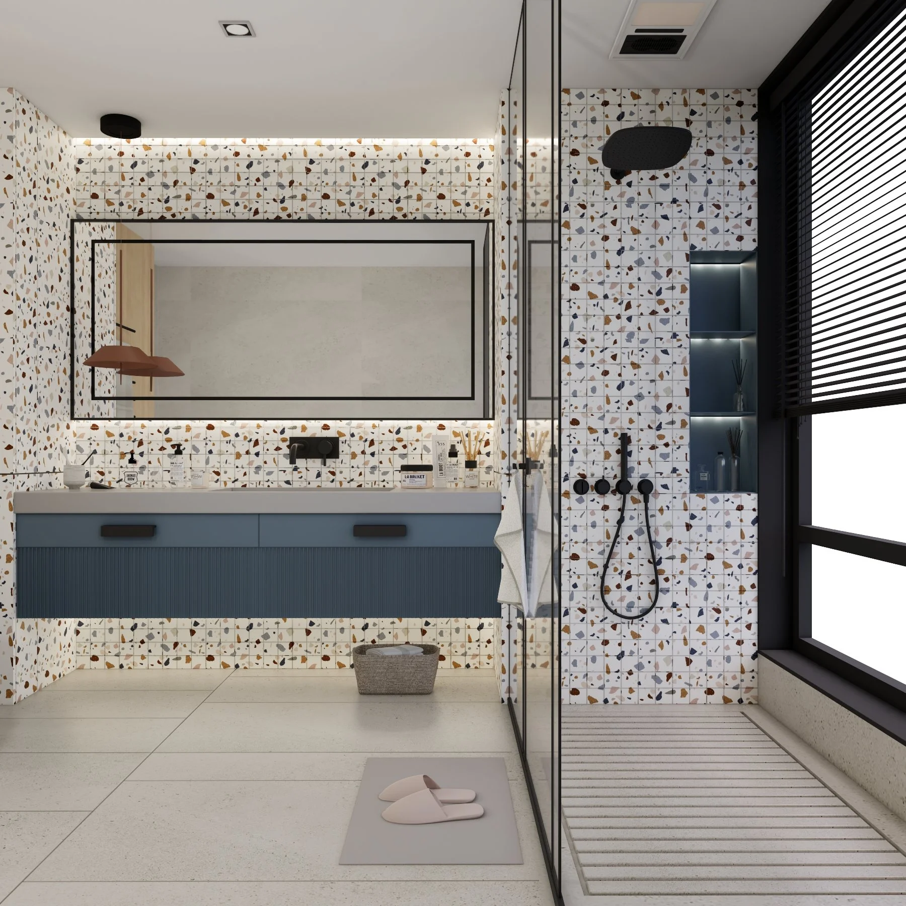 Проектът Terra представя баня, в която елегантният дизайн среща практичността в добре балансирана и модерна визия. Основен акцент в интериора са терацо плочките, които внасят динамика и характер чрез своята текстура и цветни фрагменти. Те придават леко ретро усещане, но в същото време са интерпретирани по съвременен начин, така че да се впишат хармонично в модерния контекст.